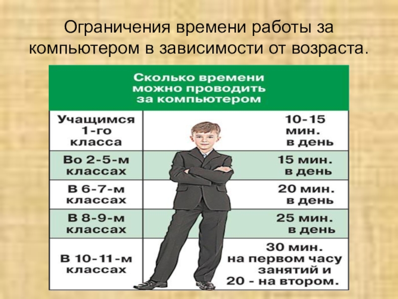 Слайд 8Ограничения времени работы за компьютером в зависимости от возраста.
