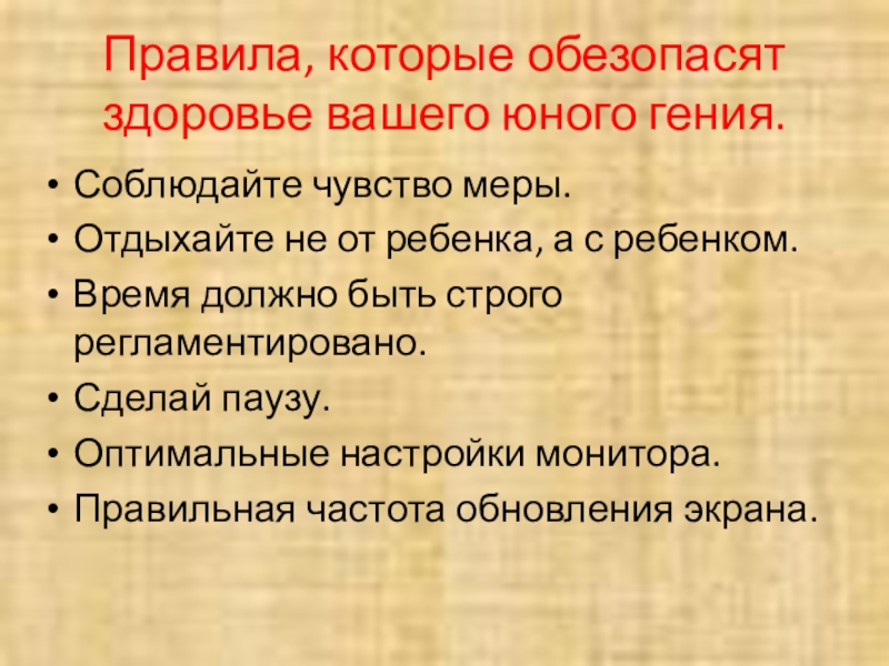 Слайд 9Правила, которые обезопасят здоровье вашего юного гения.