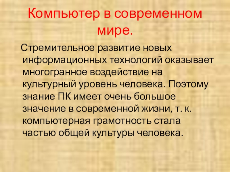 многогранное воздействие на культурный уровень человека. Поэтому знание ПК имеет очень большое значение в современной жизни, т. к. компьютерная грамотность стала частью общей культуры человека.