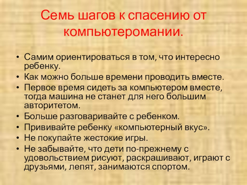 Слайд 12Семь шагов к спасению от компьютеромании.