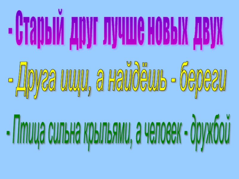 - Птица сильна крыльями, а человек - дружбой- Старый друг лучше новых двух- Друга ищи, а найдёшь