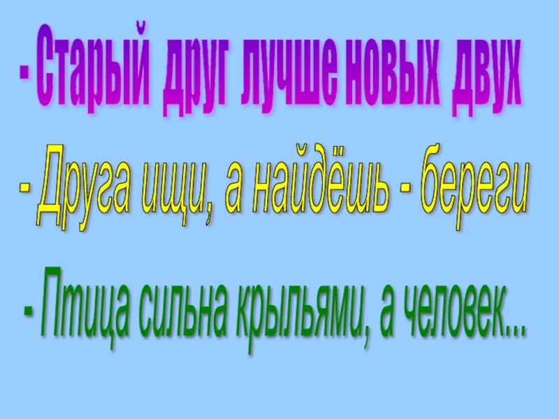 - Птица сильна крыльями, а человек...- Старый друг лучше новых двух- Друга ищи, а найдёшь - береги