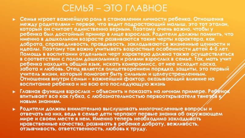 Родители должны внимательно выслушивать многочисленные вопросы и отвечать на них, ведь в семье дети черпают первые знания об окружающем мире и своем месте в нем. Именно теперь необходимо закладывать нравственные качества, развивать в ребенке доброту, вежливость, отзывчивость, ответственность, любовь к труду.