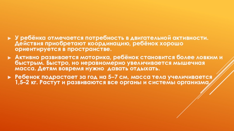 Слайд 3У ребёнка отмечается потребность в двигательной активности. Действия приобретают координацию, ребёнок