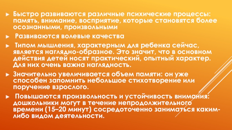 Слайд 16Быстро развиваются различные психические процессы: память, внимание, восприятие, которые становятся более