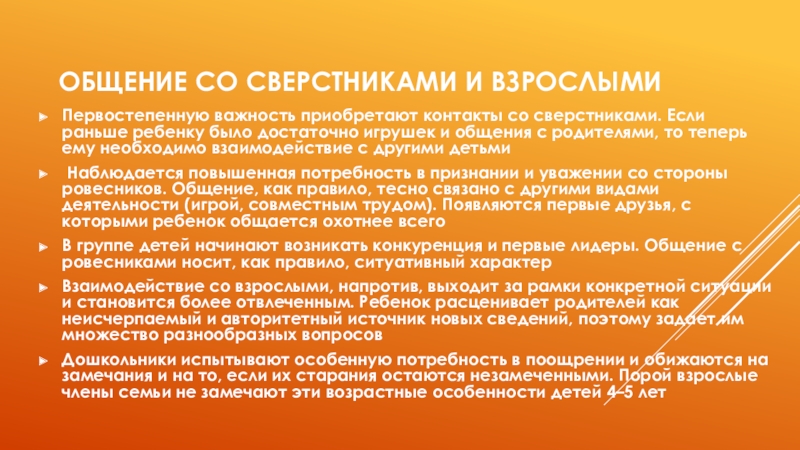 В группе детей начинают возникать конкуренция и первые лидеры. Общение с ровесниками носит, как правило, ситуативный характер