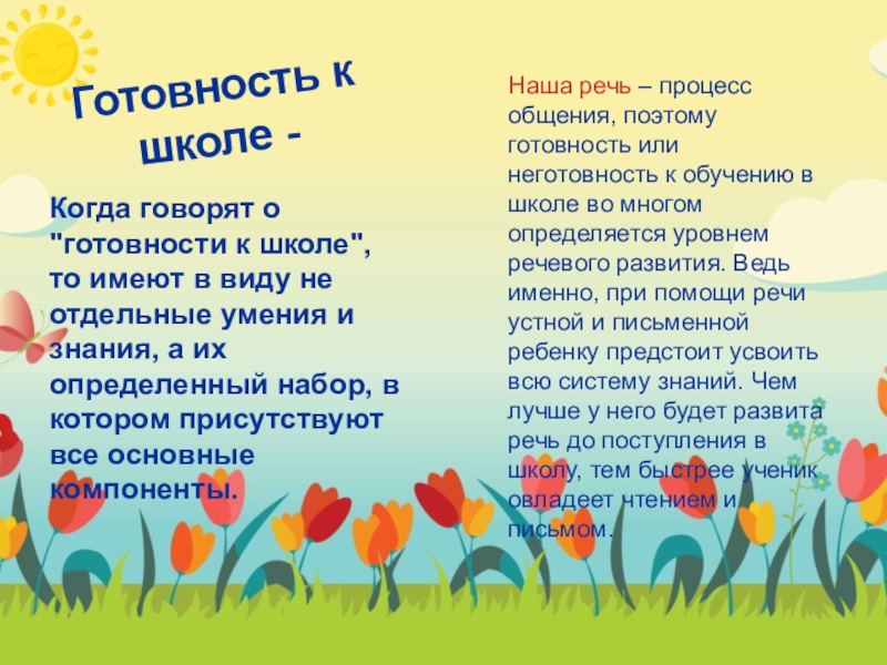 Наша речь – процесс общения, поэтому готовность или неготовность к обучению в школе во многом определяется уровнем речевого развития. Ведь именно, при помощи речи устной и письменной ребенку предстоит усвоить всю систему знаний. Чем лучше у него будет развита речь до поступления в школу, тем быстрее ученик овладеет чтением и письмом.