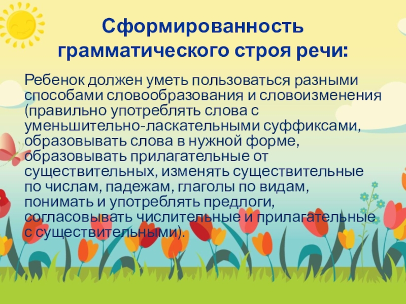 и словоизменения (правильно употреблять слова с уменьшительно-ласкательными суффиксами, образовывать слова в нужной форме, образовывать прилагательные от существительных, изменять существительные по числам, падежам, глаголы по видам, понимать и употреблять предлоги, согласовывать числительные и прилагательные с существительными).
