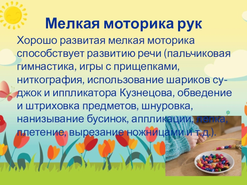игры с прищепками, ниткография, использование шариков су-джок и иппликатора Кузнецова, обведение и штриховка предметов, шнуровка, нанизывание бусинок, аппликации, лепка, плетение, вырезание ножницами и т.д.).
