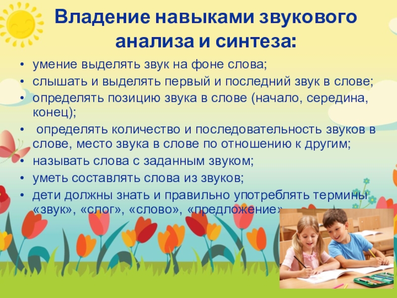 Слайд 5Владение навыками звукового анализа и синтеза: