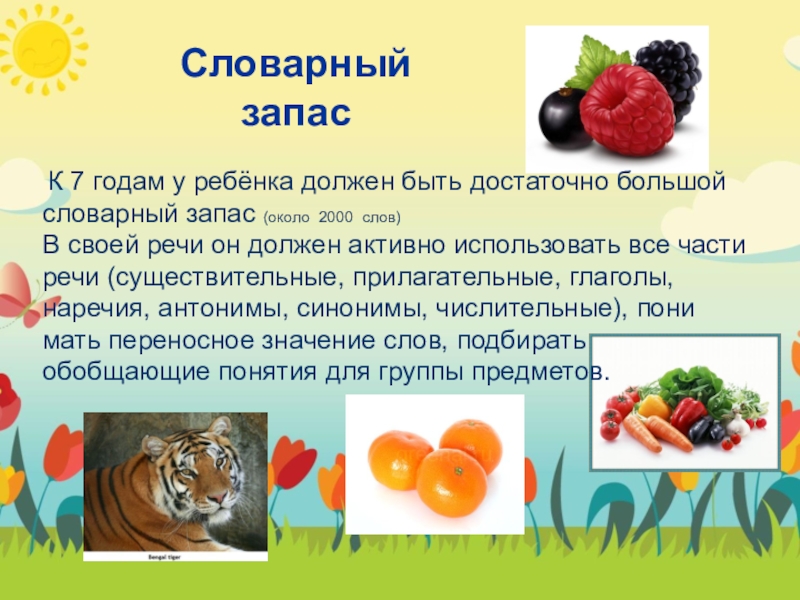 В своей речи он должен активно использовать все части речи (существительные, прилагательные, глаголы, наречия, антонимы, синонимы, числительные), пони мать переносное значение слов, подбирать обобщающие понятия для группы предметов.
