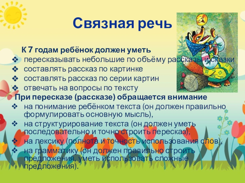 на грамматику (он должен правильно строить предложения, уметь использовать сложные предложения).