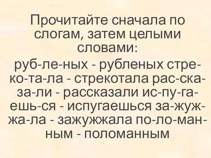 стрекотала рас-ска-за-ли - рассказали ис-пу-га-ешь-ся - испугаешься за-жуж-жа-ла - зажужжала по-ло-ман-ным - поломанным