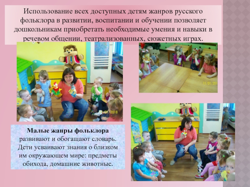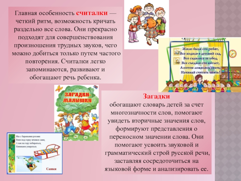Малые жанры фольклора развивают и обогащают словарь. Дети усваивают знания о близком им окружающем мире: предметы обихода, домашние животные.