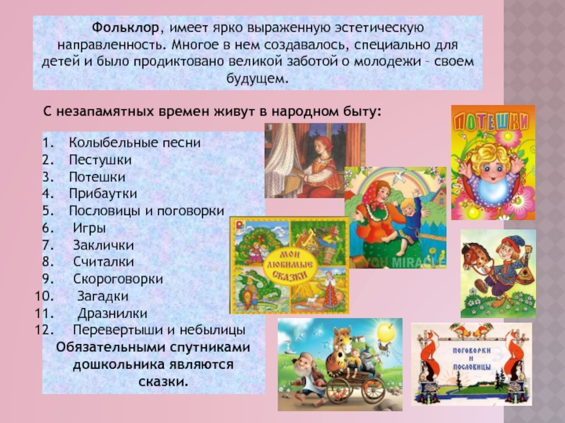Фольклор, имеет ярко выраженную эстетическую направленность. Многое в нем создавалось, специально для детей и было продиктовано великой заботой о молодежи – своем будущем.