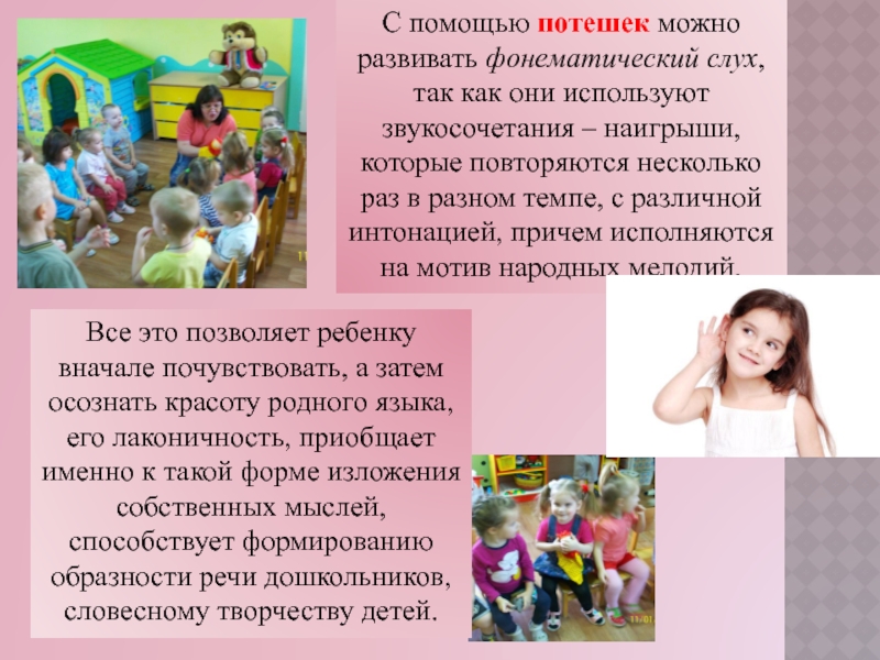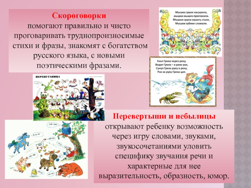 открывают ребенку возможность через игру словами, звуками, звукосочетаниями уловить специфику звучания речи и характерные для нее выразительность, образность, юмор.