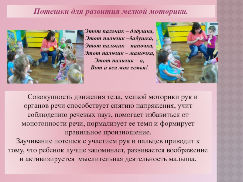 Заучивание потешек с участием рук и пальцев приводит к тому, что ребенок лучше запоминает, развивается воображение и активизируется мыслительная деятельность малыша.