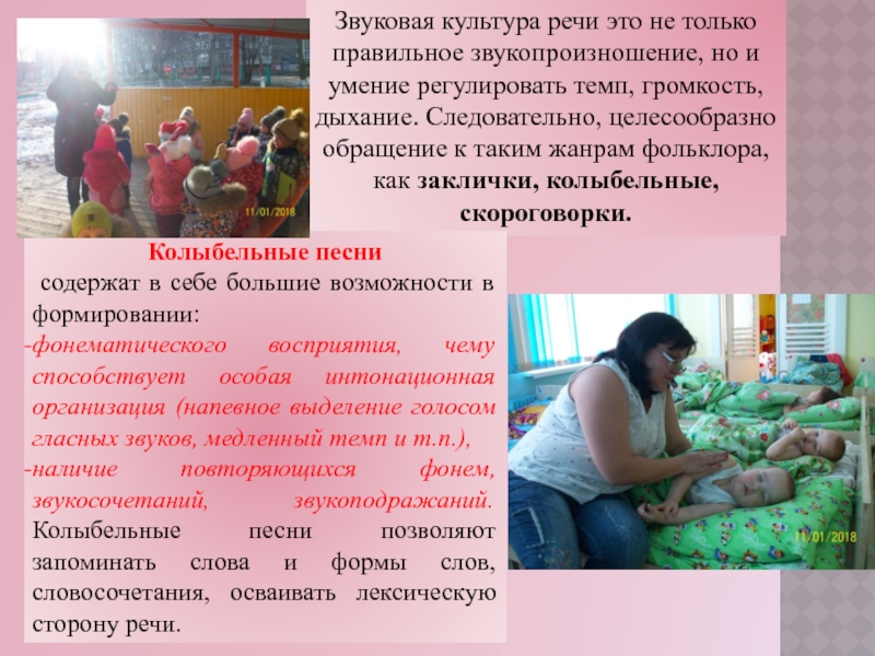 наличие повторяющихся фонем, звукосочетаний, звукоподражаний. Колыбельные песни позволяют запоминать слова и формы слов, словосочетания, осваивать лексическую сторону речи.