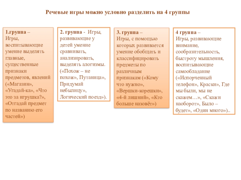 Игры, с помощью которых развивается умение обобщать и классифицировать предметы по различным признакам («Кому что нужно», «Вершки-корешки», «4-й лишний», «Кто больше назовёт»)