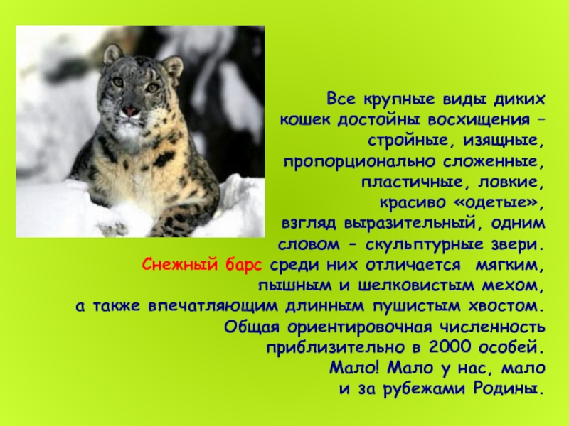 Снежный барс среди них отличается мягким, пышным и шелковистым мехом,