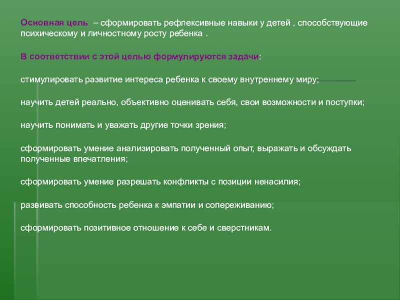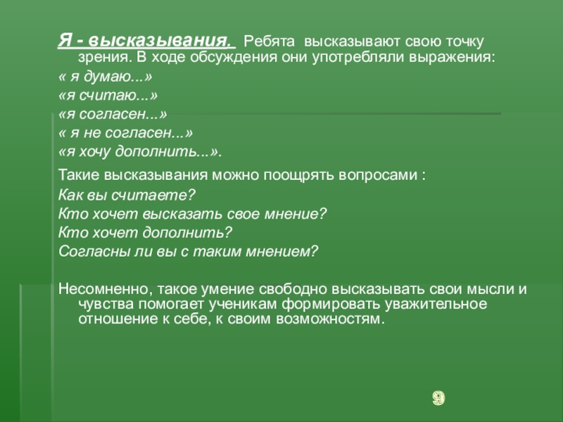 Во-первых, участие в рефлексивном круге развивает у ребят умение строить Я- высказывания, т.е говорить от первого лица, выражать свои личные мысли и чувства.