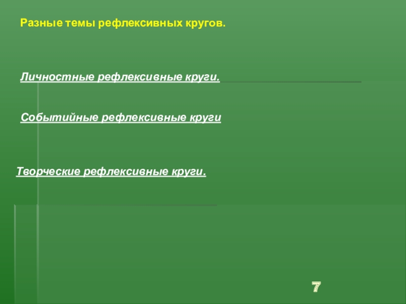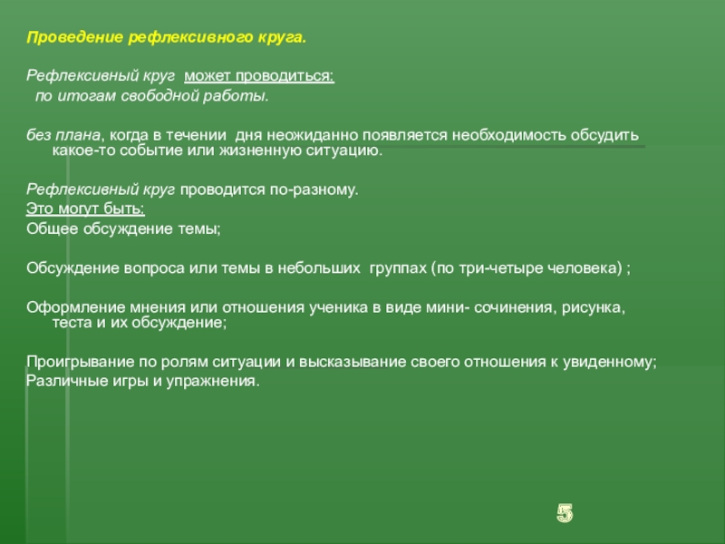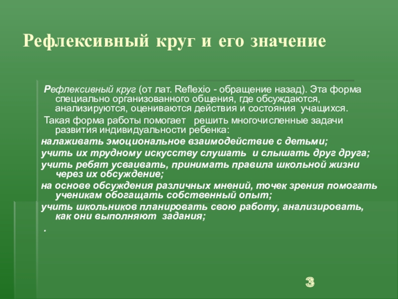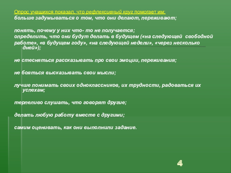 Таким образом, рефлексивный круг служит верным средством развития индивидуальности детей, так как учит их слушать и слышать друг друга, обсуждать различные мнения, точки зрения, принимать правила школьной жизни через их обсуждение, помогает ученикам обогащать собственный опыт и т.д.