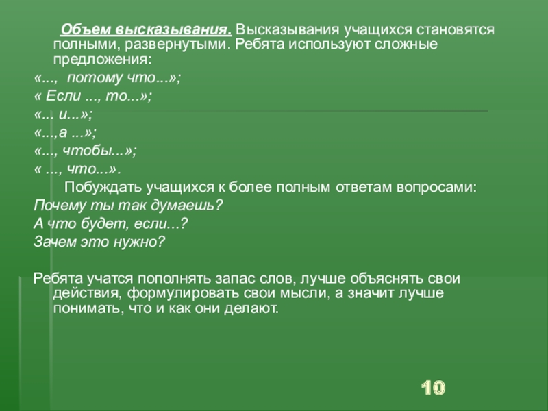 Во-вторых, работая в рефлексивном круге, учатся строить полные, развернутые высказывания, т.е расширяют объем высказывания.