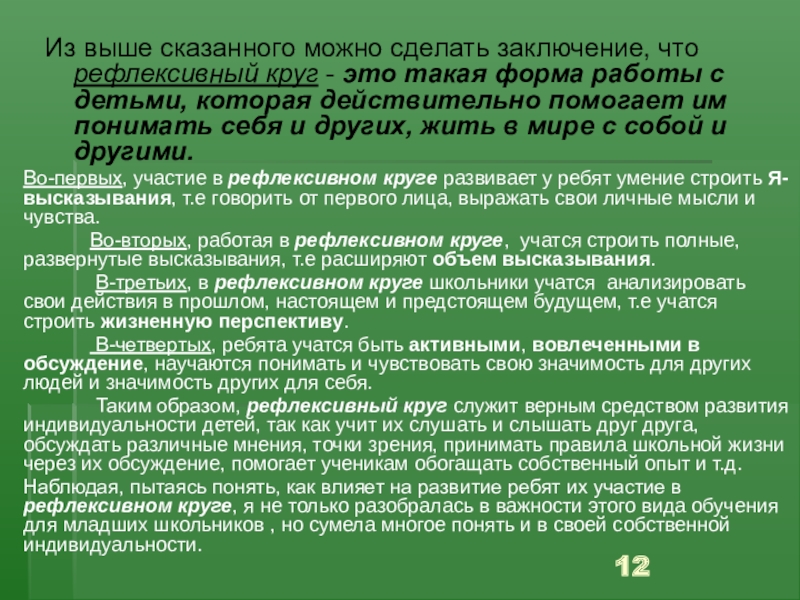 Наблюдая, пытаясь понять, как влияет на развитие ребят их участие в рефлексивном круге, я не только разобралась в важности этого вида обучения для младших школьников , но сумела многое понять и в своей собственной индивидуальности.