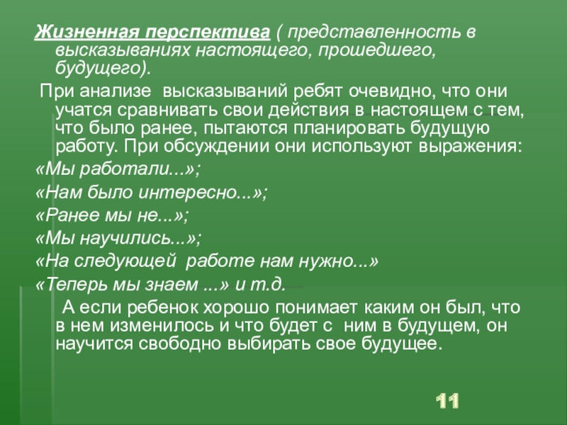 В-третьих, в рефлексивном круге школьники учатся анализировать свои действия в прошлом, настоящем и предстоящем будущем, т.е учатся строить жизненную перспективу.