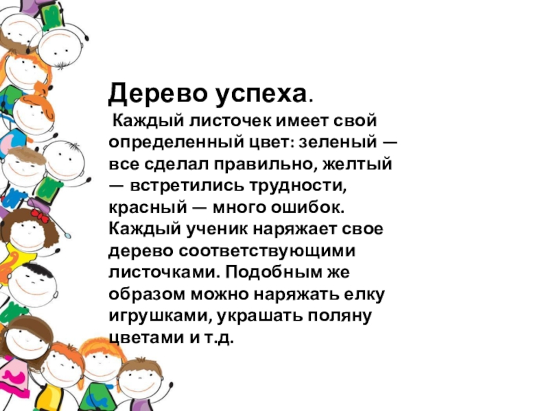 сделал правильно, желтый — встретились трудности, красный — много ошибок. Каждый ученик наряжает свое дерево соответствующими листочками. Подобным же образом можно наряжать елку игрушками, украшать поляну цветами и т.д.