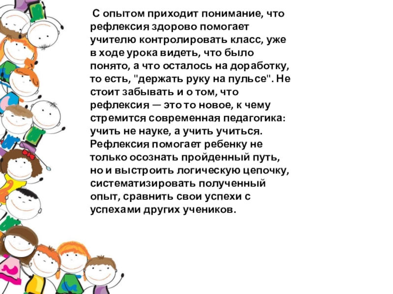 Слайд 39 С опытом приходит понимание, что рефлексия здорово помогает учителю контролировать