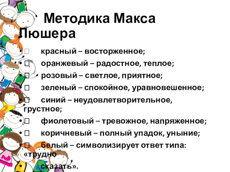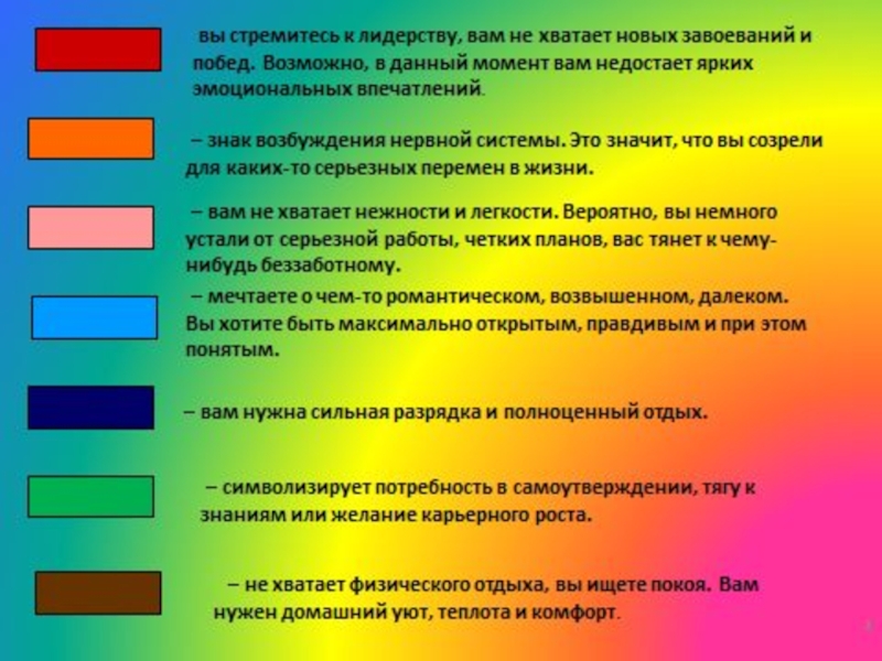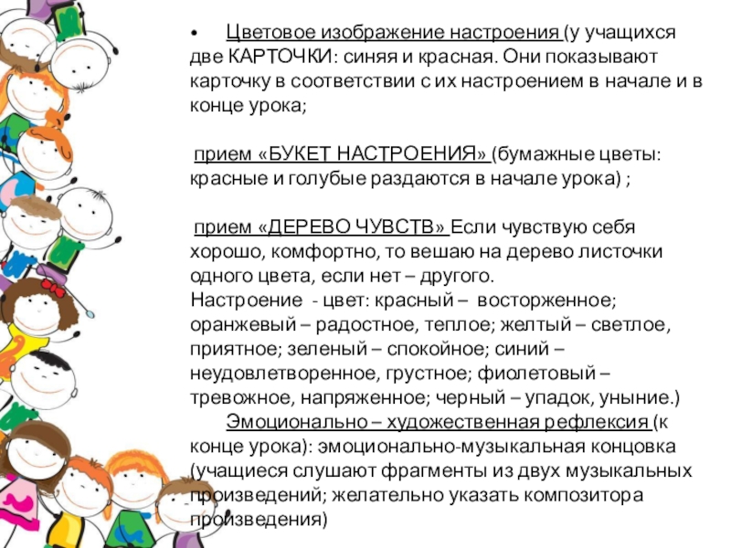 Настроение - цвет: красный – восторженное; оранжевый – радостное, теплое; желтый – светлое, приятное; зеленый – спокойное; синий – неудовлетворенное, грустное; фиолетовый – тревожное, напряженное; черный – упадок, уныние.)