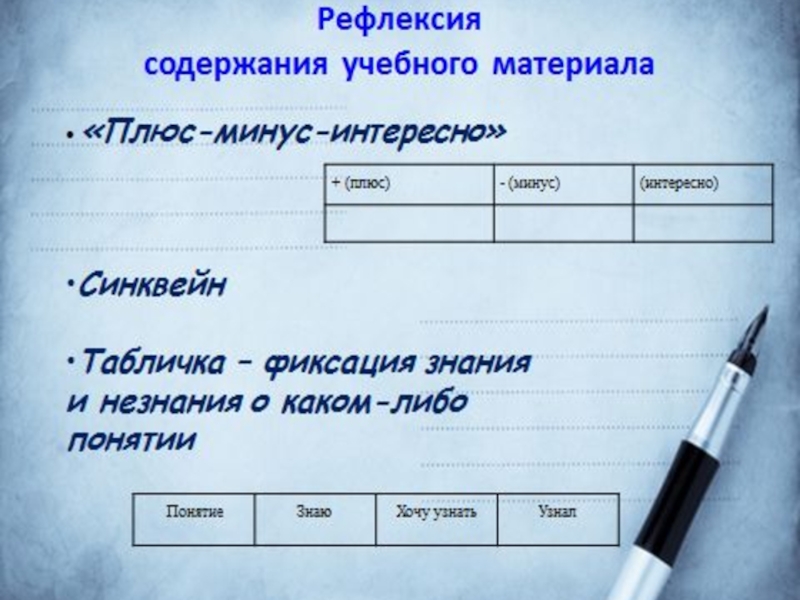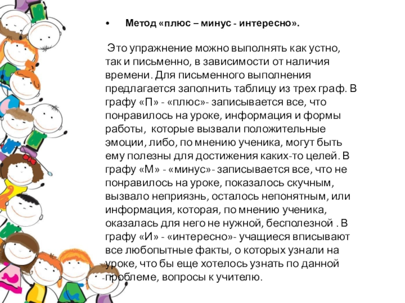 устно, так и письменно, в зависимости от наличия времени. Для письменного выполнения предлагается заполнить таблицу из трех граф. В графу «П» - «плюс»- записывается все, что понравилось на уроке, информация и формы работы, которые вызвали положительные эмоции, либо, по мнению ученика, могут быть ему полезны для достижения каких-то целей. В графу «М» - «минус»- записывается все, что не понравилось на уроке, показалось скучным, вызвало неприязнь, осталось непонятным, или информация, которая, по мнению ученика, оказалась для него не нужной, бесполезной . В графу «И» - «интересно»- учащиеся вписывают все любопытные факты, о которых узнали на уроке, что бы еще хотелось узнать по данной проблеме, вопросы к учителю.