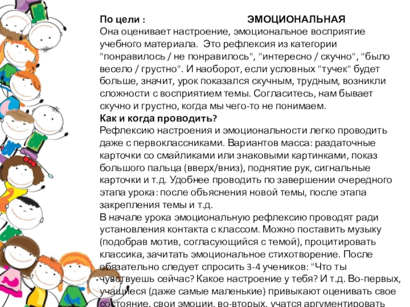 В начале урока эмоциональную рефлексию проводят ради установления контакта с классом. Можно поставить музыку (подобрав мотив, согласующийся с темой), процитировать классика, зачитать эмоциональное стихотворение. После обязательно следует спросить 3-4 учеников: "Что ты чувствуешь сейчас? Какое настроение у тебя? И т.д. Во-первых, учащиеся (даже самые маленькие) привыкают оценивать свое состояние, свои эмоции, во-вторых, учатся аргументировать свою точку зрения