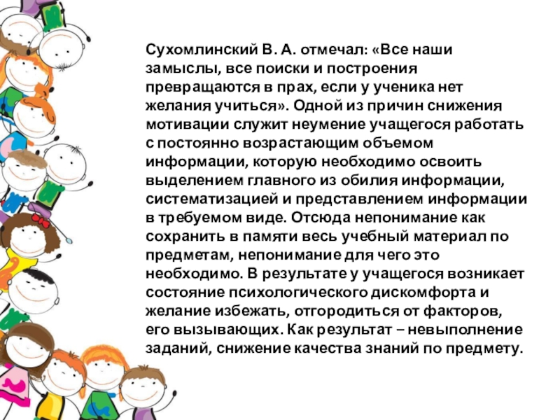 превращаются в прах, если у ученика нет желания учиться». Одной из причин снижения мотивации служит неумение учащегося работать с постоянно возрастающим объемом информации, которую необходимо освоить выделением главного из обилия информации, систематизацией и представлением информации в требуемом виде. Отсюда непонимание как сохранить в памяти весь учебный материал по предметам, непонимание для чего это необходимо. В результате у учащегося возникает состояние психологического дискомфорта и желание избежать, отгородиться от факторов, его вызывающих. Как результат – невыполнение заданий, снижение качества знаний по предмету.