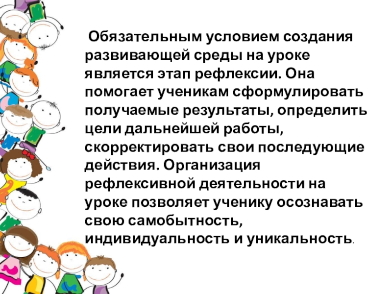 Слайд 10 Обязательным условием создания развивающей среды на уроке является этап рефлексии.