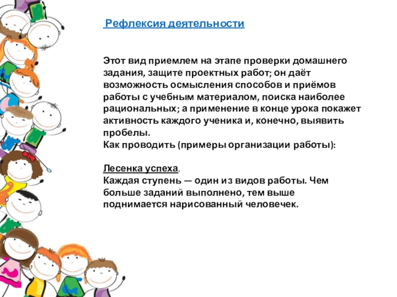 проектных работ; он даёт возможность осмысления способов и приёмов работы с учебным материалом, поиска наиболее рациональных; а применение в конце урока покажет активность каждого ученика и, конечно, выявить пробелы.