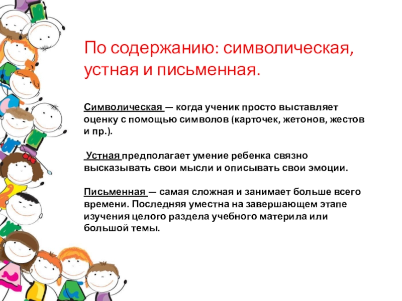 Устная предполагает умение ребенка связно высказывать свои мысли и описывать свои эмоции.