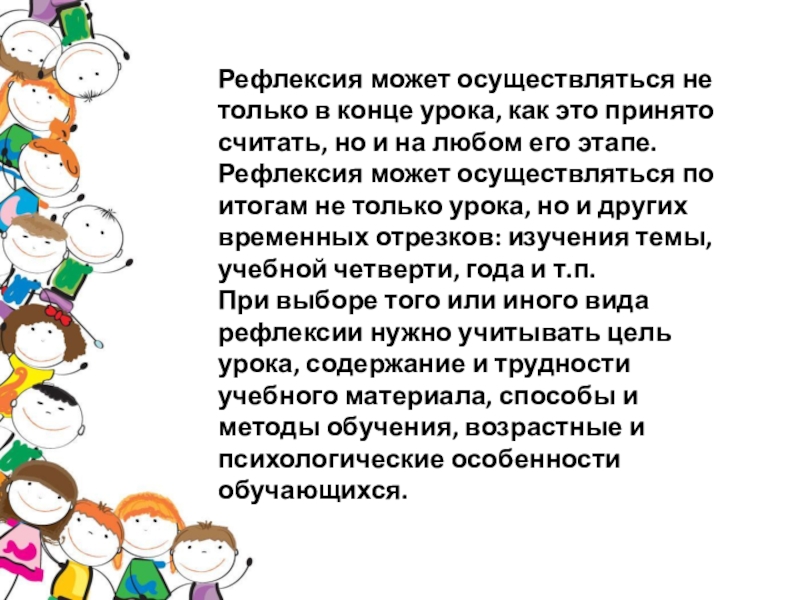 считать, но и на любом его этапе. Рефлексия может осуществляться по итогам не только урока, но и других временных отрезков: изучения темы, учебной четверти, года и т.п.