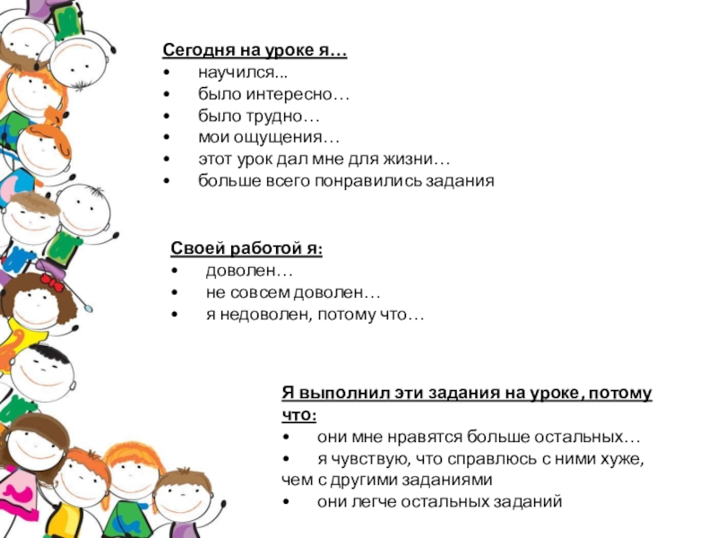 Каждый ученик выбирает по 1-2 предложения и заканчивает их. Проводить такую рефлексию можно устно, а можно и письменно (на листочках или прямо в тетради).