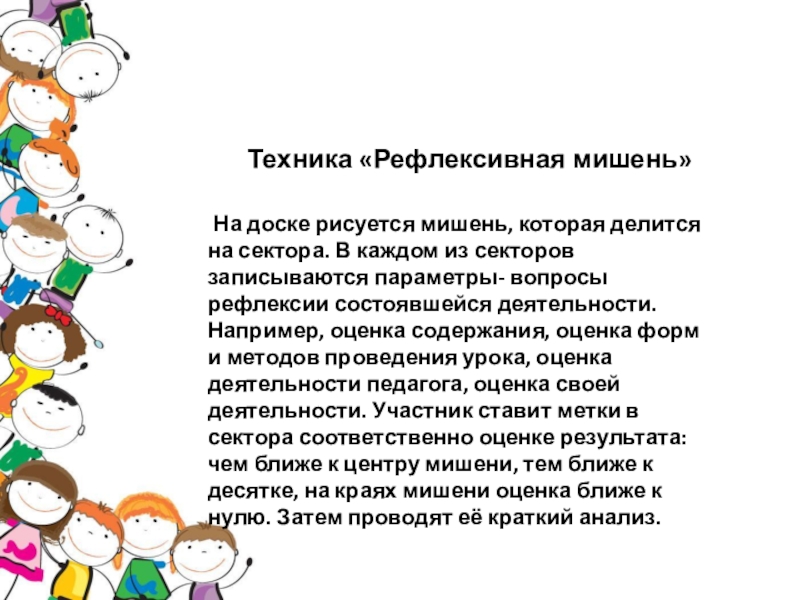 В каждом из секторов записываются параметры- вопросы рефлексии состоявшейся деятельности. Например, оценка содержания, оценка форм и методов проведения урока, оценка деятельности педагога, оценка своей деятельности. Участник ставит метки в сектора соответственно оценке результата: чем ближе к центру мишени, тем ближе к десятке, на краях мишени оценка ближе к нулю. Затем проводят её краткий анализ.