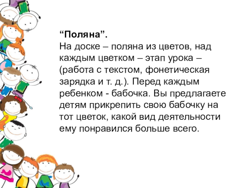 этап урока – (работа с текстом, фонетическая зарядка и т. д.). Перед каждым ребенком - бабочка. Вы предлагаете детям прикрепить свою бабочку на тот цветок, какой вид деятельности ему понравился больше всего.
