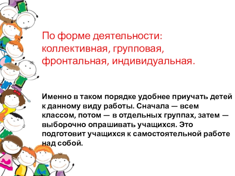 Слайд 17По форме деятельности: коллективная, групповая, фронтальная, индивидуальная.