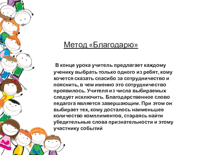 одного из ребят, кому хочется сказать спасибо за сотрудничество и пояснить, в чем именно это сотрудничество проявилось. Учителя из числа выбираемых следует исключить. Благодарственное слово педагога является завершающим. При этом он выбирает тех, кому досталось наименьшее количество комплиментов, стараясь найти убедительные слова признательности и этому участнику событий