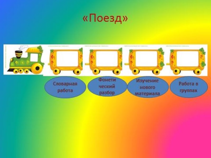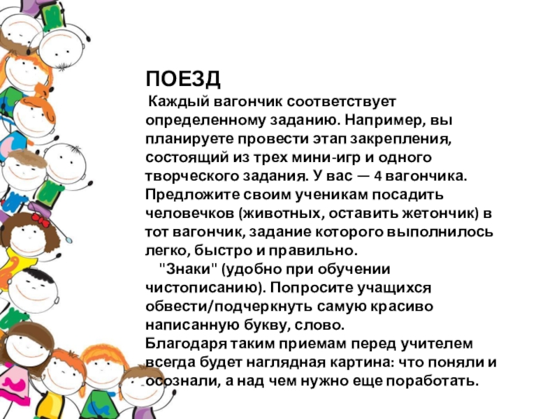 закрепления, состоящий из трех мини-игр и одного творческого задания. У вас — 4 вагончика. Предложите своим ученикам посадить человечков (животных, оставить жетончик) в тот вагончик, задание которого выполнилось легко, быстро и правильно.