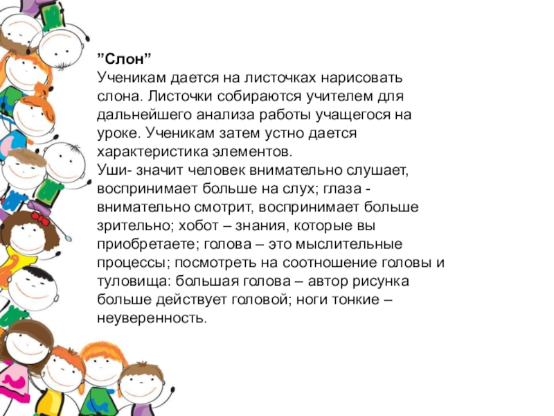 Уши- значит человек внимательно слушает, воспринимает больше на слух; глаза - внимательно смотрит, воспринимает больше зрительно; хобот – знания, которые вы приобретаете; голова – это мыслительные процессы; посмотреть на соотношение головы и туловища: большая голова – автор рисунка больше действует головой; ноги тонкие – неуверенность.