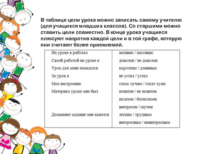 классов). Со старшими можно ставить цели совместно. В конце урока учащиеся плюсуют напротив каждой цели и в той графе, которую они считают более приемлемой.
