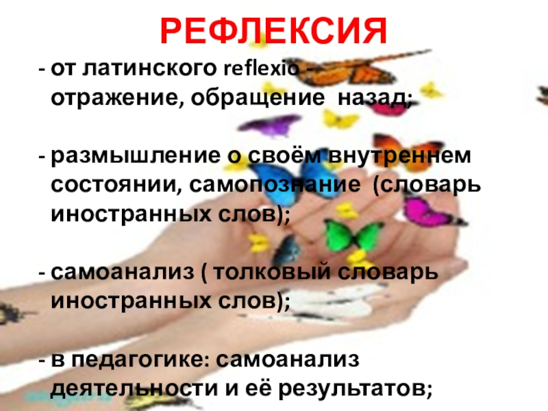 РЕФЛЕКСИЯот латинского reflexio - отражение, обращение назад;размышление о своём внутреннем состоянии, самопознание (словарь иностранных слов);самоанализ ( толковый словарь иностранных слов);в педагогике: самоанализ деятельности и её результатов;