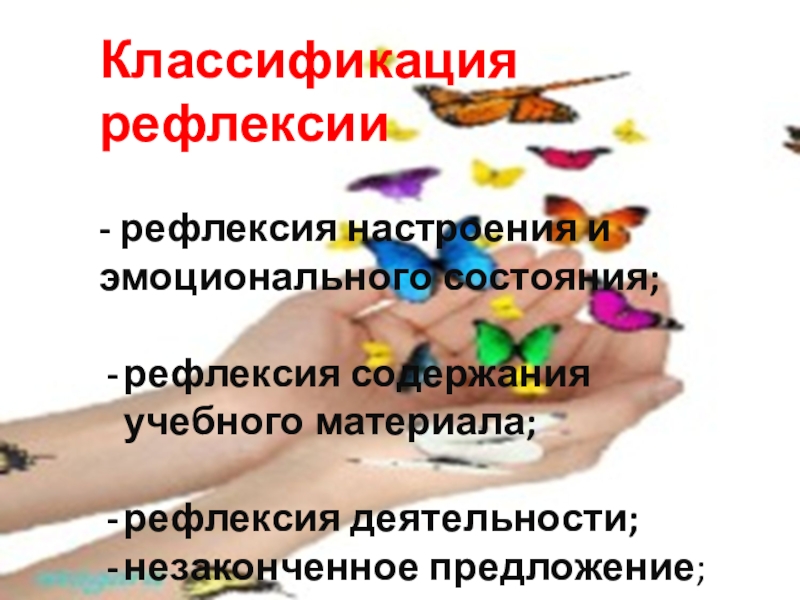 Классификация рефлексии - рефлексия настроения и эмоционального состояния;рефлексия содержания учебного материала;рефлексия деятельности;незаконченное предложение;