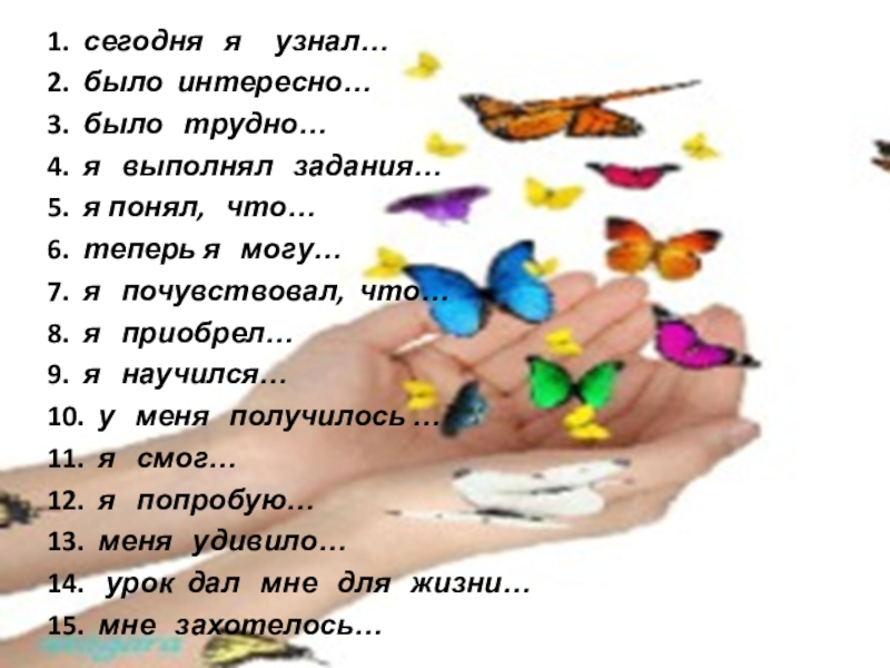 1.  сегодня  я   узнал…2.  было интересно…3.  было  трудно…4.  я  выполнял  задания…5.  я понял,  что…6.  теперь я